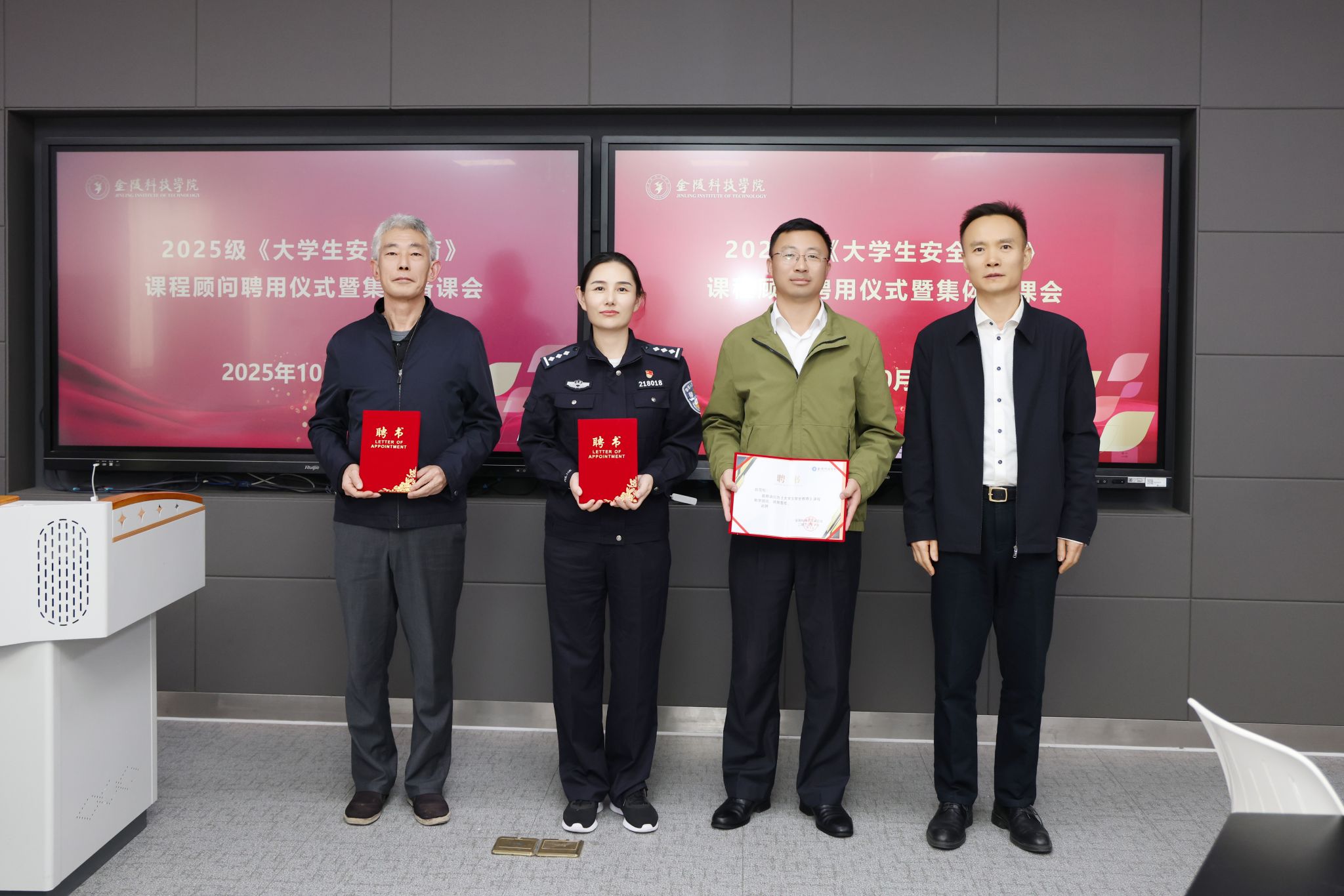 10月22日下午,我校2025级《大学生安全教育》课程顾问聘用仪式暨集体备课会在知行楼A418智慧教室举行。南京市公安局江宁分局高新区派出所副所长李琳、南京工程学院保卫处处长张景胜、中国药科大学保卫处副处长赵雪松应邀参会,副校长王延光出席会议并讲话,2025级《大学生安全教育》课程全体任课教师参加会议。