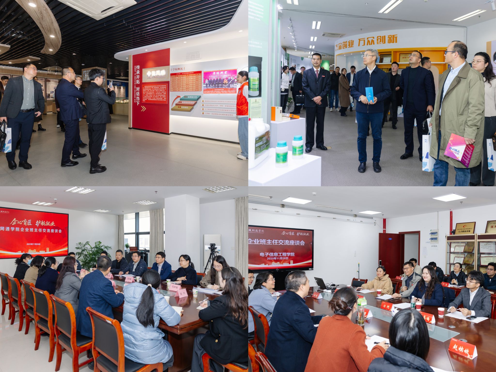 聘任仪式结束后,企业班主任分组参观了校史馆与金科创客汇,深入了解学校办学历史与事业发展取得的成就。随后,各二级学院召开企业班主任座谈会,围绕实践教学、实习就业等议题展开深入交流。