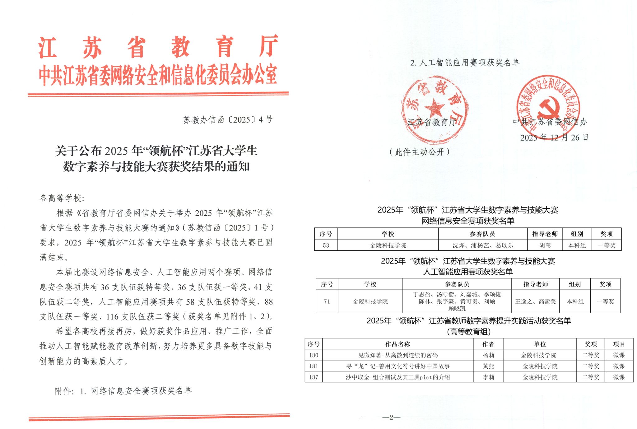 近日,在由江苏省教育厅、中共江苏省委网络安全和信息化委员会办公室联合主办的2025年“领航杯”多项大赛中,我校师生表现优异,荣获一等奖2项、二等奖3项。其中,在江苏省大学生数字素养与技能大赛网络信息安全赛项中,胡苇老师指导的学生团队荣获本科组一等奖;在江苏省大学生数字素养与技能大赛人工智能应用赛项中,王逸之、高素美老师指导的学生团队荣获本科组一等奖;在江苏省教师数字素养提升实践活动中,杨莉、黄燕、李莉等老师作品分别荣获二等奖各1项,充分展现了学校师生在数字素养与技能人才培养领域的扎实成效。