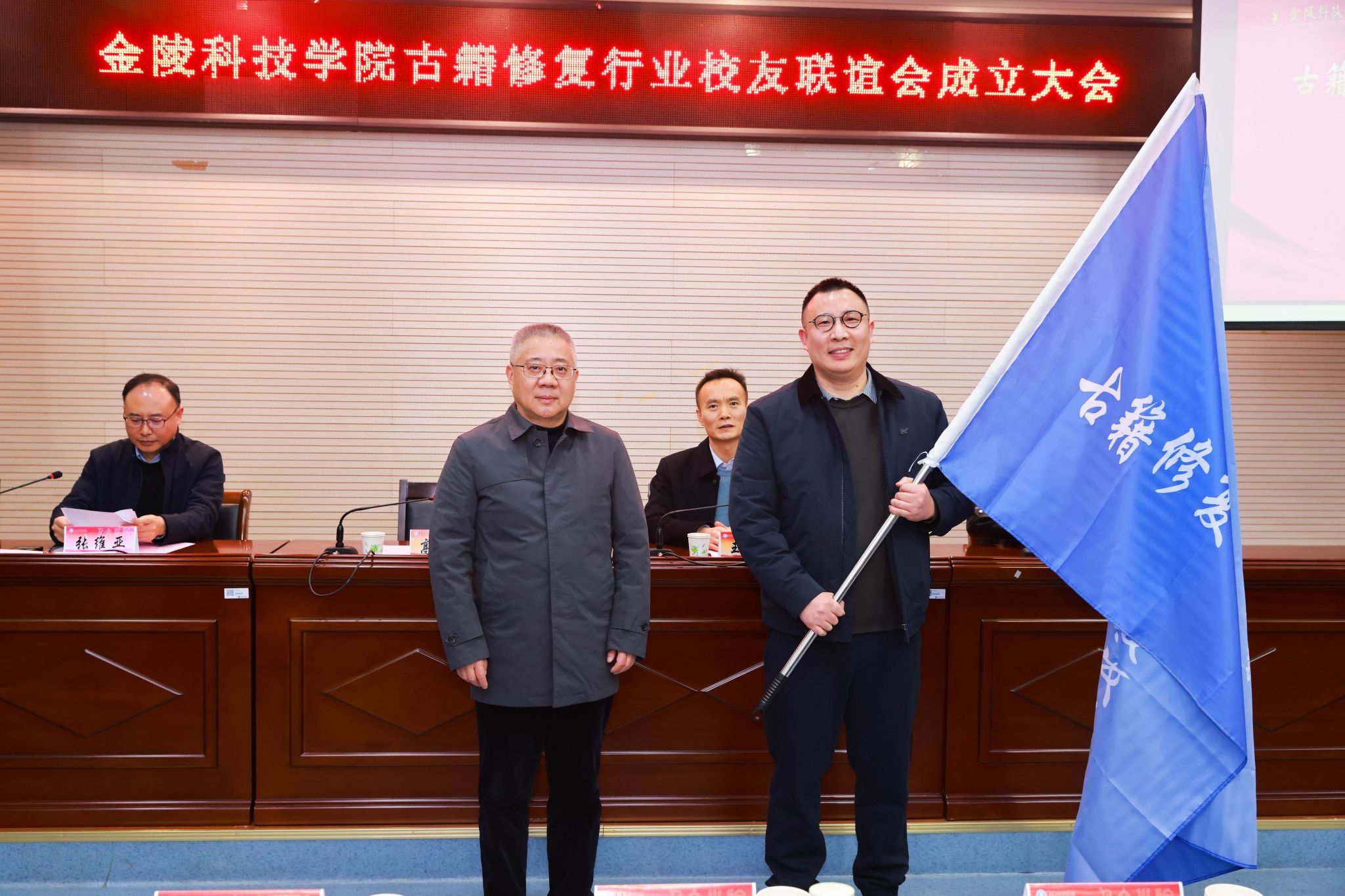 高永祥为联谊会授牌、授旗并讲话。他表示,我校古籍修复专业作为全国第一个古籍修复本科专业,自2004年开设以来,依托省文旅厅重点实验室、南京非遗研究基地、南京学研究基地等省市级平台,以建设首批国家古籍保护人才培训基地为契机,培养了一批有情怀、重交叉、强能力的古籍保护创新人才。广大校友在不同岗位上诠释着金科人的深厚文化担当,合力铸就了日益彰显影响力的“金科修复”品牌。他指出,古籍修复是一项功在当代、利在千秋的事业,需心怀敬畏、传承匠心,与时俱进、开拓创新。作为学校首个专业领域的行业校友组织,希望广大校友以此为平台,加强联络、深化合作,将分散的个体力量汇聚成“抱团发展”的行业合力,使联谊会成为凝聚情感、共享共赢的精神家园。他期待广大校友和各界人士持续关心支持学校发展,助力专业建设与人才培养,共同开展技艺推广、文化科普、志愿服务等活动,携手守护中华文脉,推动文化传承创新,为增强文化自信、建设文化强国贡献金科力量。