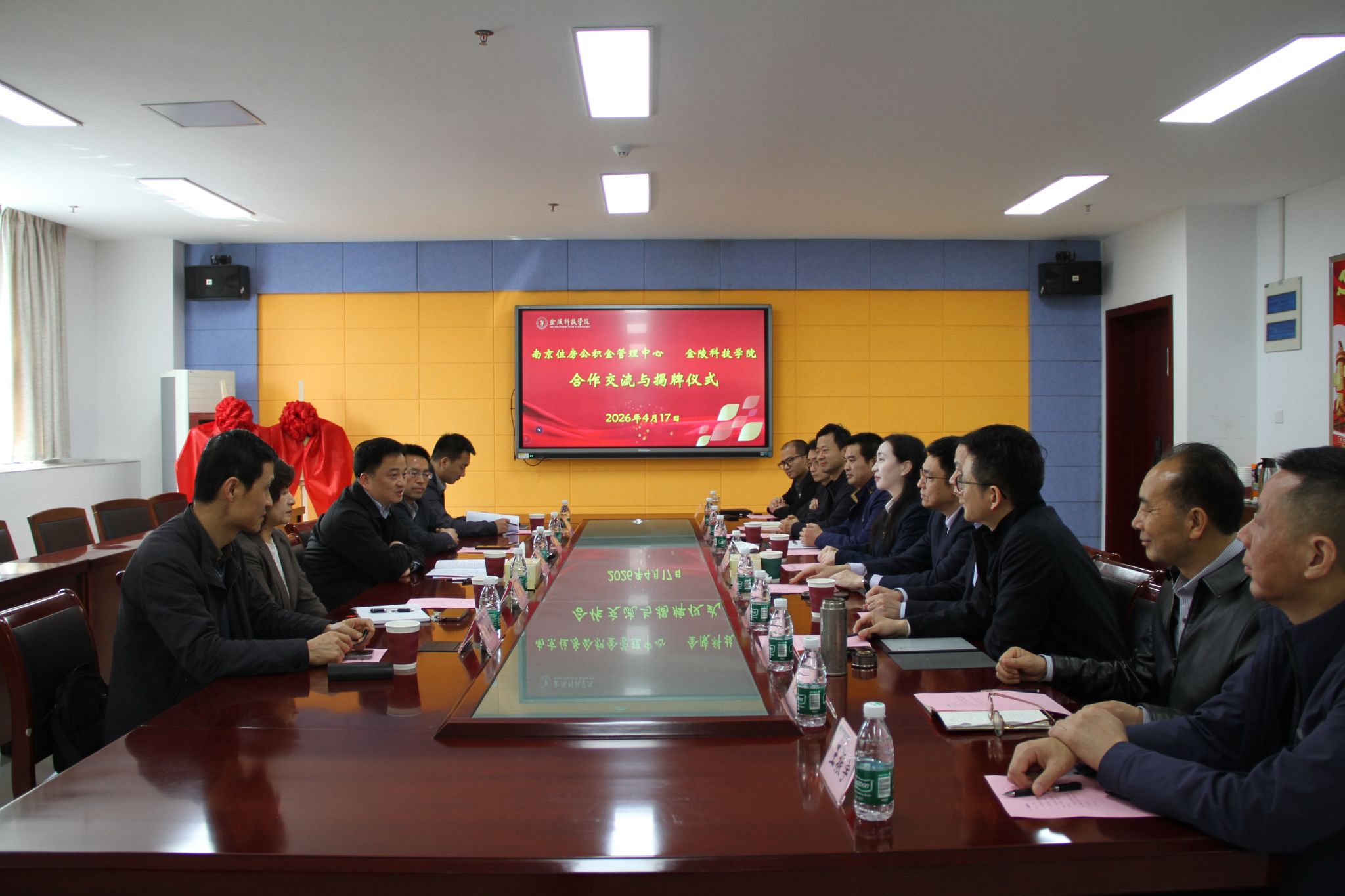 为深化校地融合、推进产教协同育人,4月17日上午,我校与南京住房公积金管理中心合作交流会暨揭牌仪式在科技楼3号楼409会议室举行。南京住房公积金管理中心党组成员、副主任华晓炜,人事处处长冯春,原城中分中心主任金林俊,南京市注册会计师协会会长张世福;我校副校长顾晓燕,纪委副书记、纪委办公室主任周骏,招生与就业指导处处长喻强,教务处副处长刘旭明,商学院全体班子成员及相关负责人参加会议。会议由商学院院长刘磊主持。
