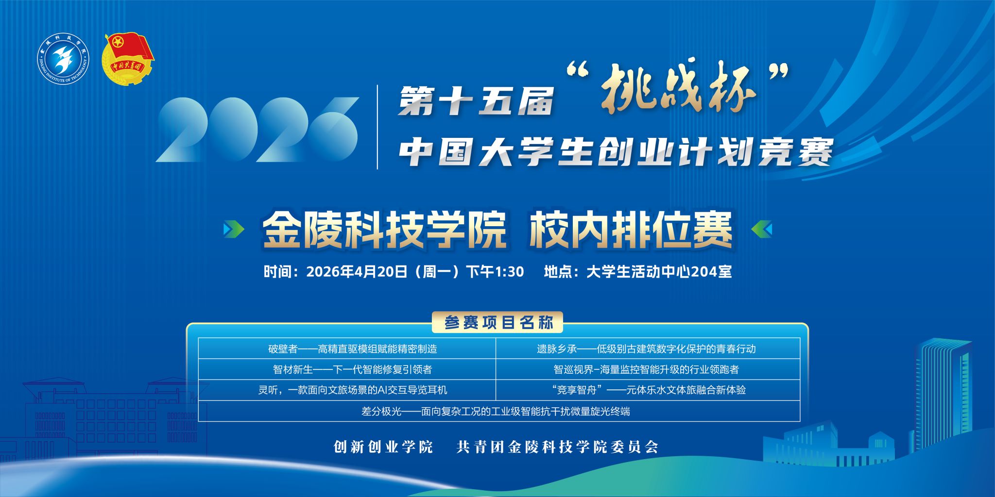 为进一步打磨项目质量、优中选优备战省级赛事,学校于4月20日下午在大学生活动中心204会议室举办校内排位赛,结合本次决赛成绩综合评定省级参赛资格,遴选出最具竞争力的项目代表学校冲击省级赛事奖项。下一步,学校将以本次赛事成果为依托,集中优势资源开展省赛参赛项目“一对一”专项培育工作,针对性补强项目技术短板、优化答辩呈现效果,为青年学生参与科创实践提供更精准的指导、更广阔的平台、更全面的支持,全力推动我校参赛项目在本届“挑战杯”江苏省赛中取得突破性成绩,助力更多金科青年的创新梦想在更高水平赛事舞台上落地开花。
