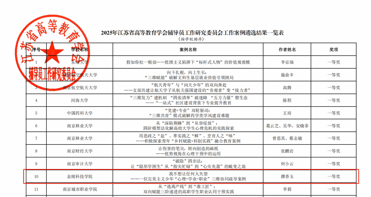根据江苏省高等教育学会辅导员工作研究会发布的《关于公布2025年江苏省高等教育学会辅导员工作研究委员会辅导员工作案例遴选结果的通知》,我校建筑工程学院辅导员濮香玉申报的《我不想让任何人失望——一位完美主义少年“心理-学业-职业”三维协同疏导案例》荣获2025年江苏省辅导员工作案例一等奖。此次获奖是我校在此类辅导员专项评比中的新突破,展现了我校辅导员队伍专业素养扎实的良好风貌。