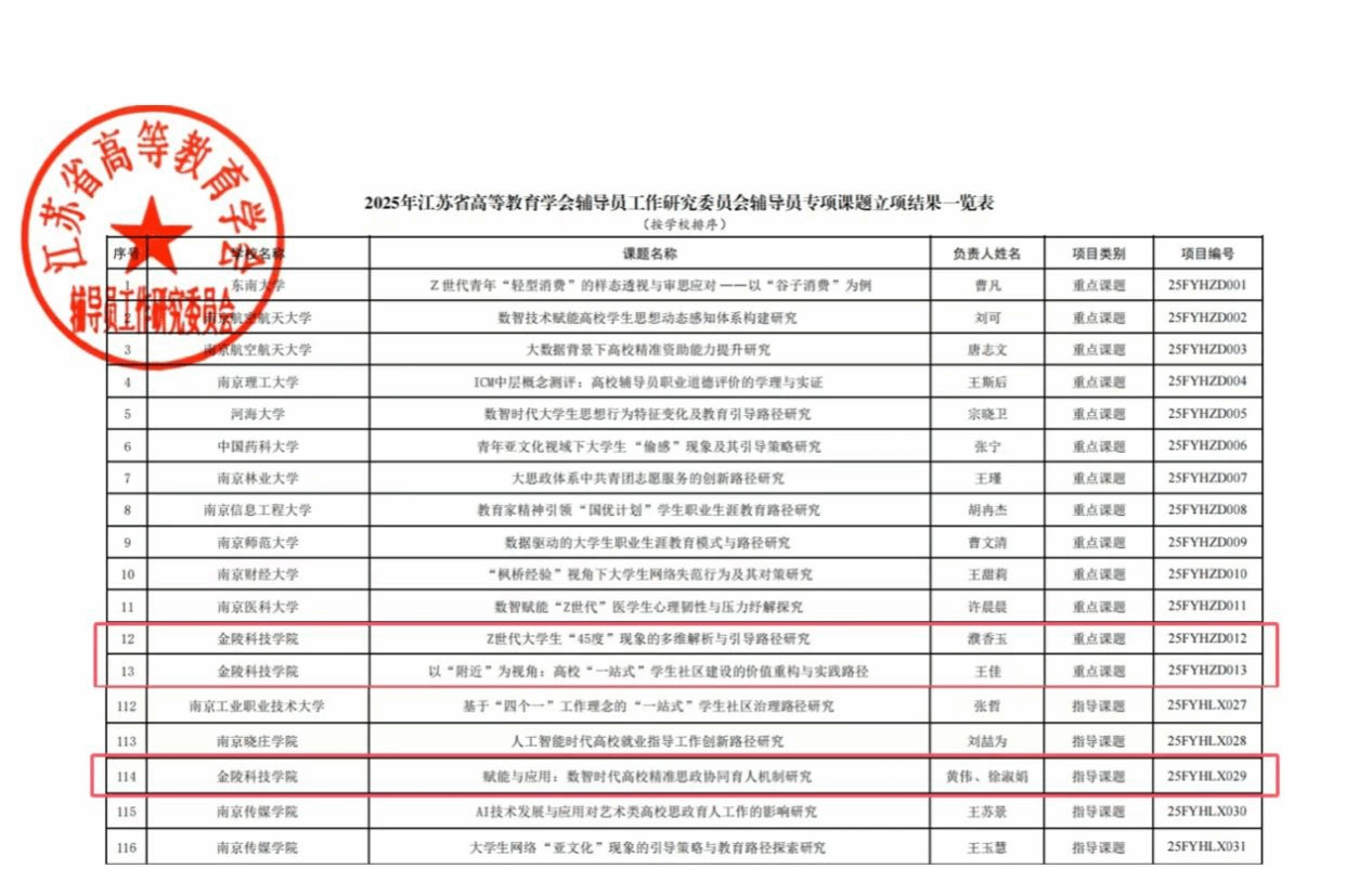 此外,濮香玉申报的《Z世代大学生“45度”现象的多维解析与引导路径研究》、机电工程学院辅导员王佳申报的《以“附近”为视角:高校“一站式”学生社区建设的价值重构与实践路径》立项2025年江苏省高等教育学会辅导员工作研究会专项课题重点项目;智能科学与控制工程学院辅导员黄伟、园艺园林学院辅导员徐淑娟申报的《赋能与应用:数智时代高校精准思政协同育人机制研究》立项2025年江苏省高等教育学会辅导员工作研究会专项课题指导项目。我校辅导员立项课题研究方向紧扣思政工作前沿,围绕学生思想引导、社区建设、数智育人等核心工作领域,为我校思政育人质量提升提供理论支撑,也是我校学生工作高质量发展成果的重要体现。