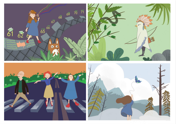 顾梦莹是个喜欢幻想,对未来充满憧憬的女同学,在她的插画作品《安妮的奇想》中,主人公安妮和亲人舞蹈歌唱,在大自然放飞风筝······,整幅作品造型简洁、色彩和谐。