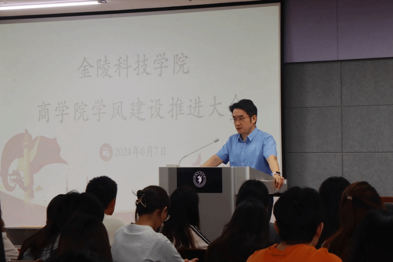 大会伊始,学院副书记孙亮做学院学风建设工作报告,他围绕商学院学风建设模式、学风建设成效、当前学风建设不足、学风建设要求四个方面来展开。强调学院始终坚持以生为本、全员育人,致力于培养全面发展专业人才。 以专业实习、学科竞赛、实践调研等为抓手,引导学生积极参加“互联网+”、挑战杯等赛事,所培养的学生在挑战杯、“互联网+”等赛事中斩获佳绩。针对当前学院学风建设的不足之处,孙亮书记提出了一系列具体要求:第一,坚持“五不三带”;第二,要求党员、班委和积极分子发挥带头作用,每堂课前三排就座,上课前所有学生将手机统一放置于班级手机袋中;第三,每个班级设立一名学风监督员,确保学风建设各项政策有效执行。此外,学院还将严格执行学生违纪处分办法,积极开展学业预警,对考试作弊等行为零容忍。