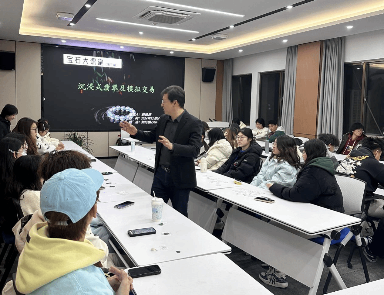 活动现场气氛轻松活泼,蔡老师别出心裁特别设计了一个沉浸式模拟翡翠交易环节,让同学们仿佛置身于真实的交易场景中。通过模拟交易,大家不仅体验了翡翠交易的实际流程,还深入了解了如何评估翡翠的价格和鉴别其品质。蔡老师与现场同学们积极互动,耐心解答了大家在交易过程中的疑问,使大家对翡翠市场有了更加直观且深入的理解。