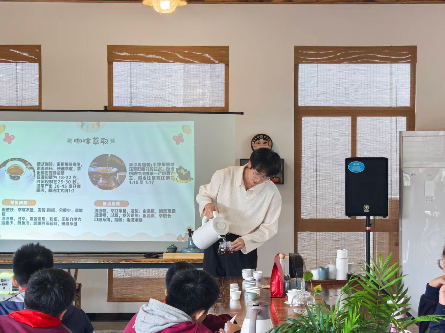 授课人庄学彬以通俗方式开篇,从咖啡“源头”切入,对比讲解咖啡豆品种差异及浅、中、深烘焙度对口感的影响,同时关联此前茶叶分类知识,助学子快速建立“茶与咖啡”认知联结。随后聚焦咖啡萃取,详解意式高压与手冲慢速两种方式的区别,现场演示手冲咖啡全流程,并邀学生品尝稀释咖啡,以味觉体验深化理解。“茶咖创意发散”环节,授课人通过讲解茶咖文化演变、分享经典搭配案例,引导学子结合白茶、乌龙茶等构思专属配方,“茉莉花茶 + 手冲咖啡”“陈皮普洱茶 + 意式咖啡”等创意层出不穷。