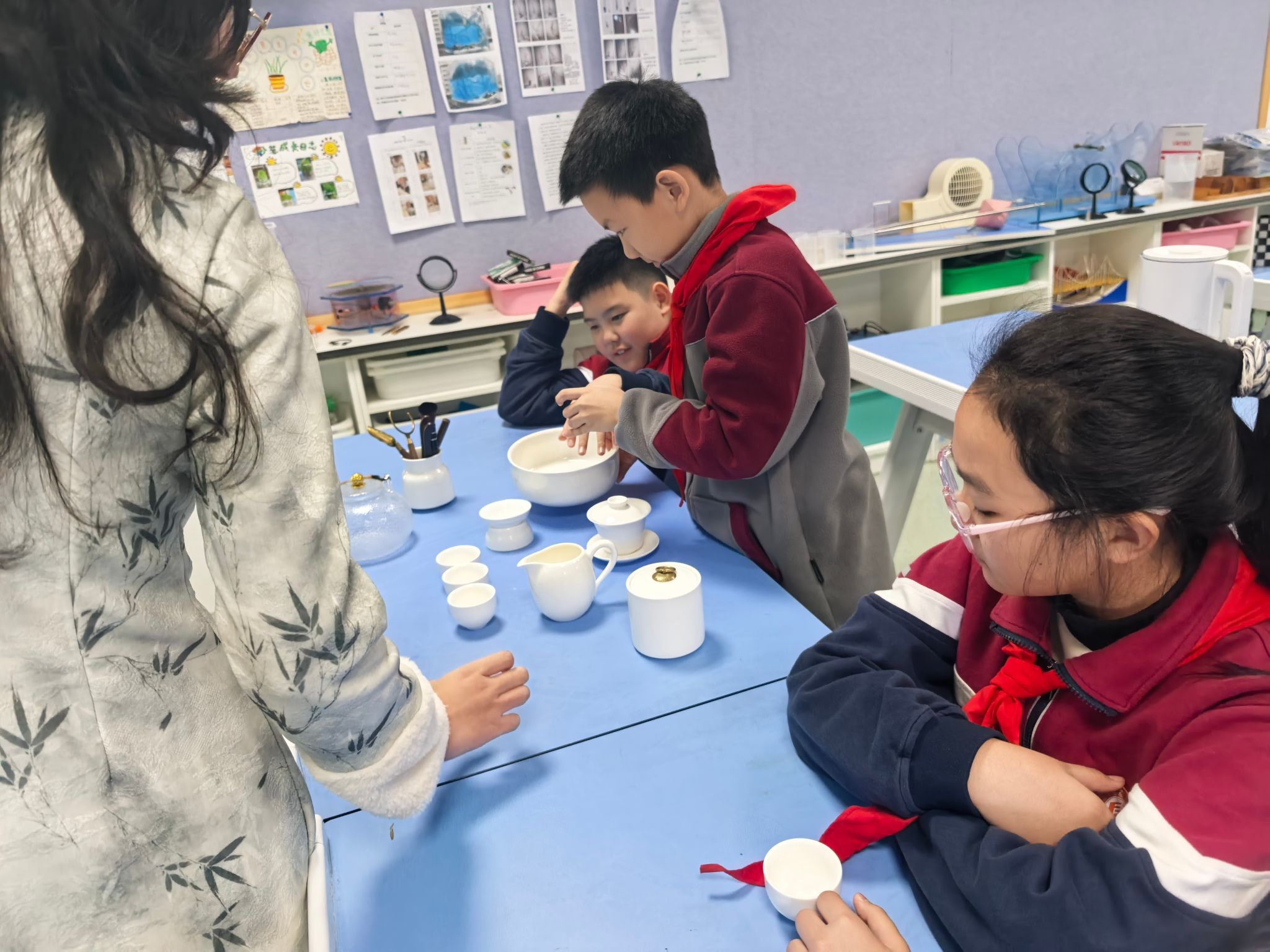 动手实践环节,孩子们分组实操盖碗冲泡,在志愿者的实时指导下调整注水角度与出汤速度。大家牢记“七分茶三分情”的礼仪,将茶汤倒至七分满,避免“茶满送客”的误区,课堂上茶香氤氲、秩序井然。从生疏试探到流畅操作,孩子们在实践中体会茶艺乐趣,成就感满满。