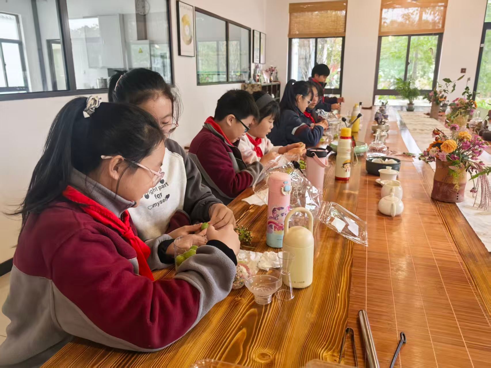 课程伊始,茶社负责人带同学们回顾果茶“先汉雏形、后唐渐盛”的历史与“酸甜均衡”的要点。雪克杯、梅花型滤水器等器具亮相时,不少同学能准确叫出名称,扎实积累获称赞。“制作果茶先洗手!”实操“玫瑰青提”果茶时,同学被及时提醒卫生规范。在大学生志愿者指导下,孩子们剥青提、捣果泥、兑茶汤,当茉莉绿茶遇上青提果肉,一杯杯果茶新鲜出炉,孩子们满是成就感。点评环节,负责人针对饮品偏酸问题,引导大家用“酸甜均衡”知识调整。“加勺糖浆就不酸了!”同学们在试错中深化理解。负责人演示的“日落”果茶,橙香与红茶味交融,让孩子们直呼过瘾。