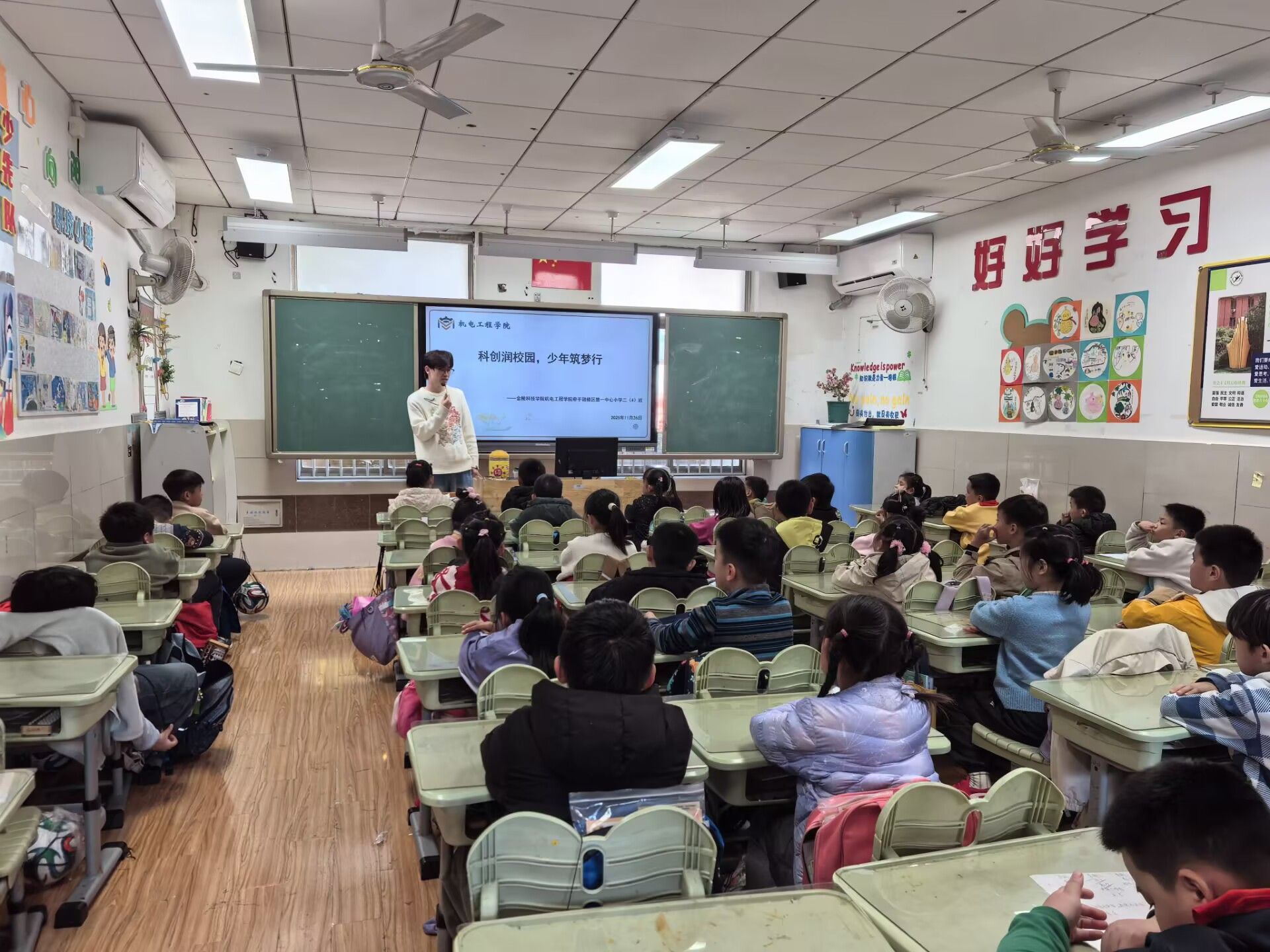 高校智慧“零距离”,王赛雨以生动讲解开启科技之旅,巧用马达小船、球形齿轮、机械臂、篮球机器人等趣味科技模型导入主题,用直观可见的动态演示拆解机械原理,将抽象科技知识转化为鲜活场景,快速吸引学生注意力,激发探索兴趣。随后,消防巡检机器人、竞速机器人、智能侦察机器人车依次亮相,通过模拟实操、互动体验展现科技魅力,团队成员精心指导学生调试指令、操作运行,在沉浸式体验中传递科创理念。现场学生踊跃提问、积极参与,在欢声笑语中触摸科技、萌发创新意识。我院“行走的科创课堂”将前沿科技转化为孩子们看得见、摸得着的互动体验,架起课本知识与现实应用的桥梁,让科学思维的种子在孩子们心中“生根发芽”。