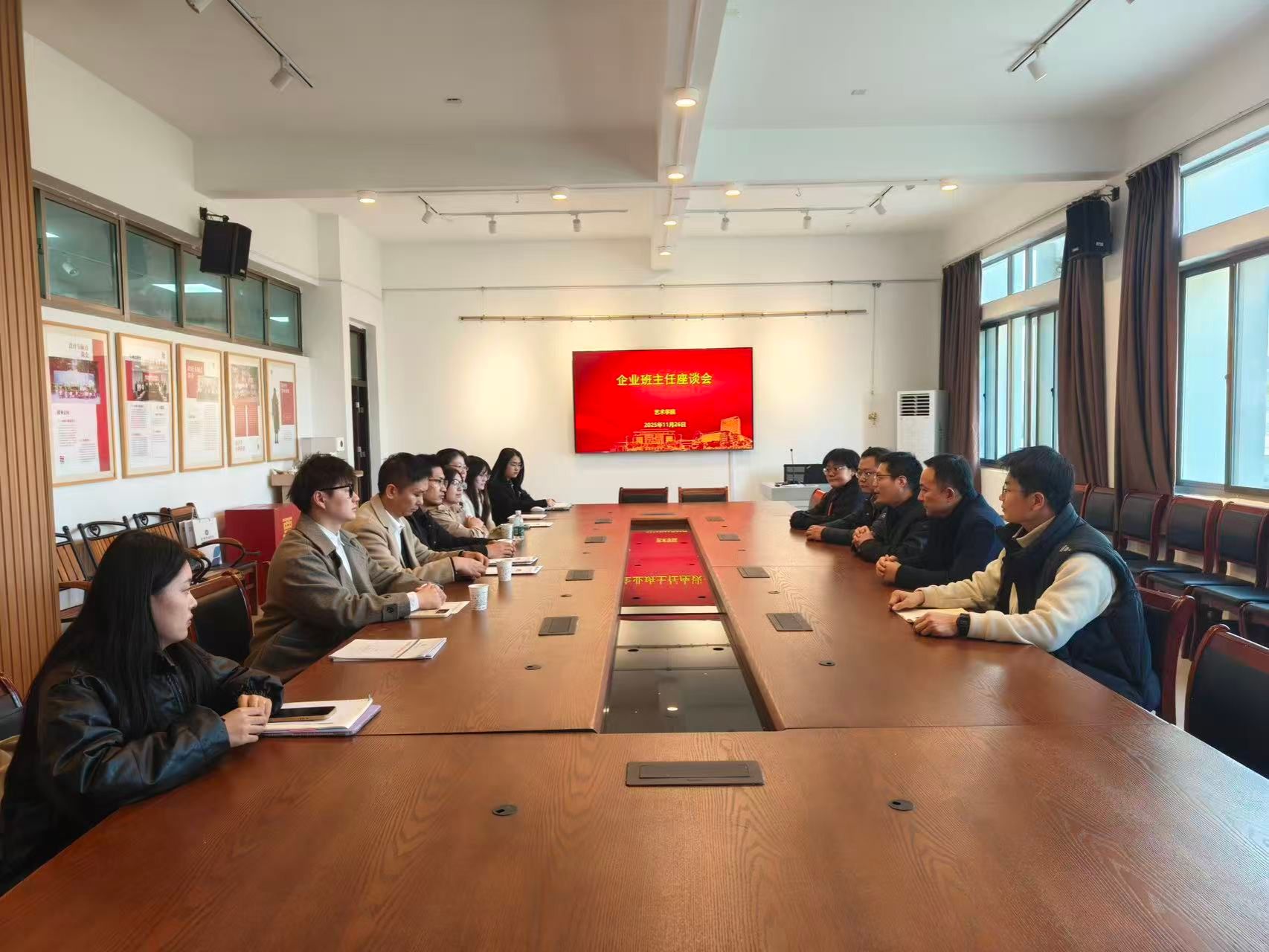 会上,各方围绕实践教学、实习就业等师生关注的重点话题深入交流探讨,积极交换思路,碰撞出协同育人的新火花。匡才远同志与企业班主任团队聚焦校企协同育人核心议题,就学院如何深化校企合作、凝聚师生育人合力展开重点研讨。与会人员一致认为,需以“校内+校外”双班主任护航模式为重要抓手,深耕产教融合领域,推动企业优质资源与教育教学需求深度契合。