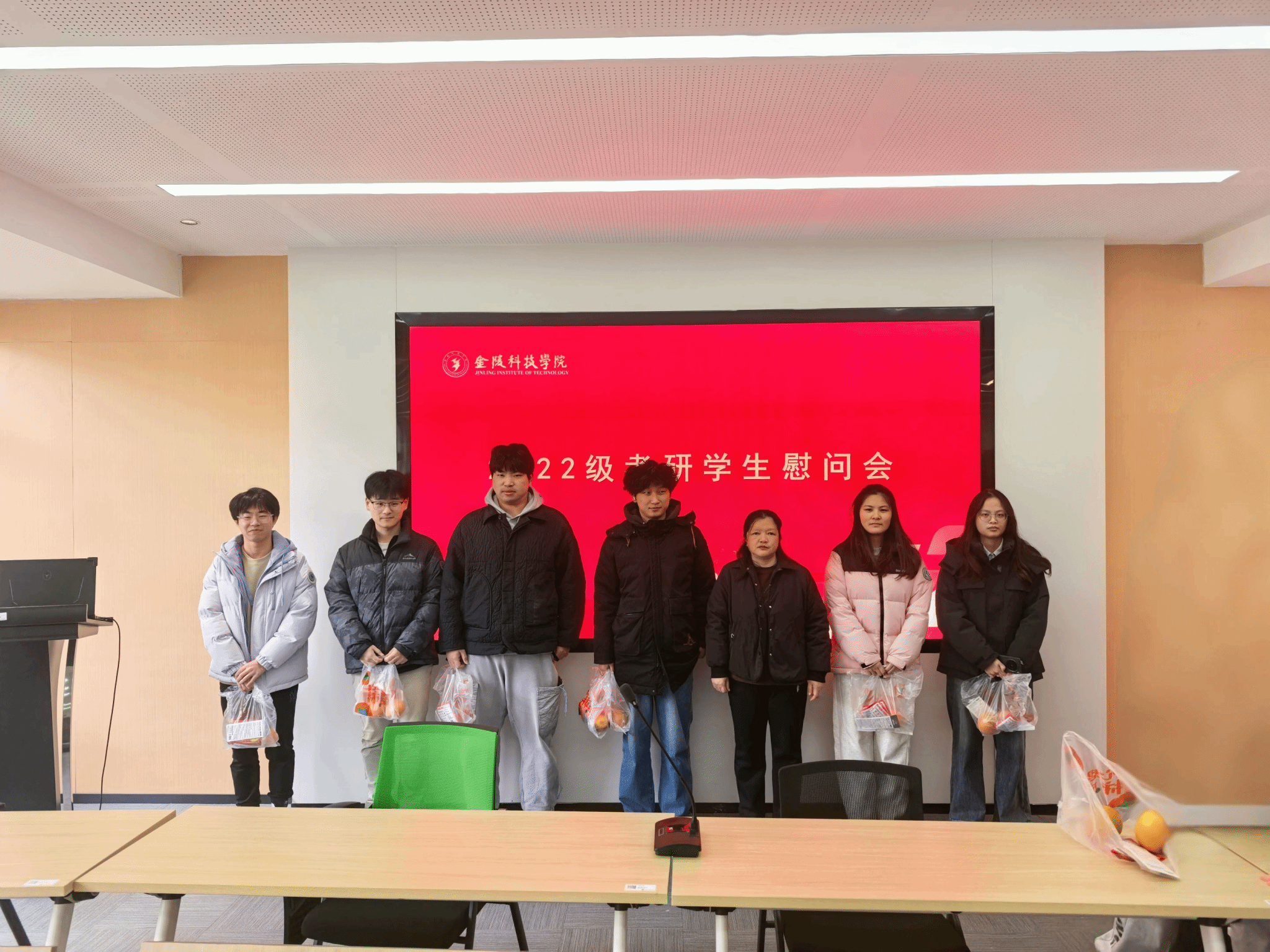 活动现场暖意浓浓,甘书记为学子递上定制“考研助力包”,里面既有承载“前程似锦”期许的新鲜橙子、驱散寒意的暖宝宝,也有涂卡笔等考研专用文具,礼包袋上“心想事成”的字样更是直击人心。