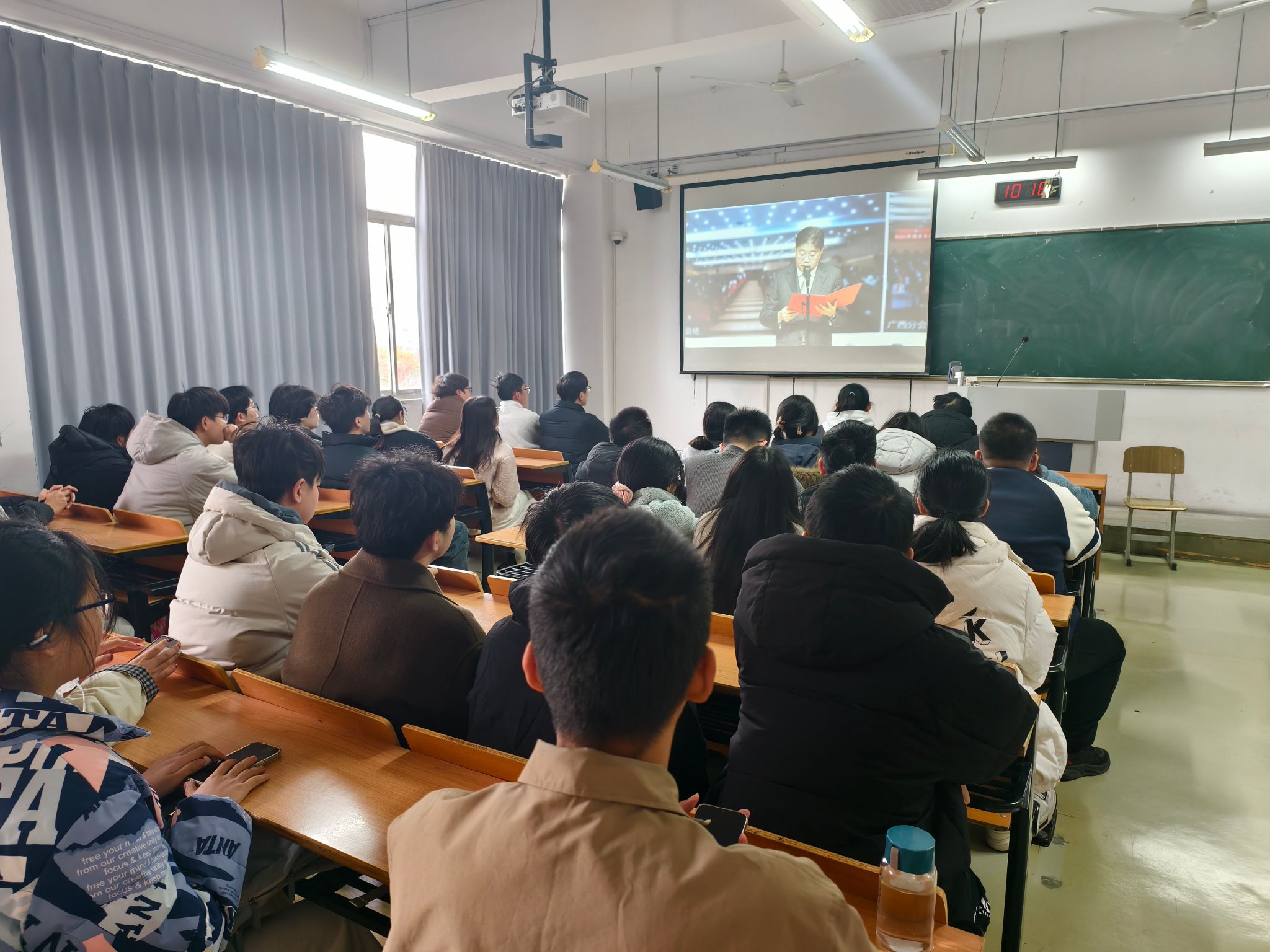 在庄严的氛围中,同学们跟随直播节奏,齐声朗读宪法条文,重点学习了宪法中关于国家根本制度、公民权利义务等内容。活动现场秩序井然,学习氛围浓厚。