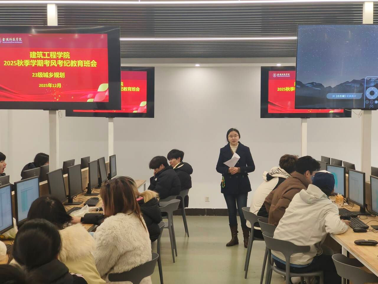 在各班级班会上,大家深入学习了《金陵科技学院学生违纪处分办法》《金陵科技学院关于进一步加强考风考纪的实施意见》《金陵科技学院学士学位授予工作实施细则》等文件,结合“五不三带”课堂秩序要求,常态化开展了学风督查检查。各班主任精准掌握学业预警学生情况,依据《金陵科技学院本科生学业预警和学业帮扶管理办法》开展针对性帮扶,引导学生明确学习目标,增强自主学习能力。各班级组织学生学习了《考场规则》等相关规定,签署《大学生文明守纪承诺书》,引导学生自觉抵制违纪作弊行为,维护考试公平公正。此外,各班级还组织开展了抵御和防范宗教向校园渗透教育、防范电信网络诈骗宣传教育、宿舍安全教育等。