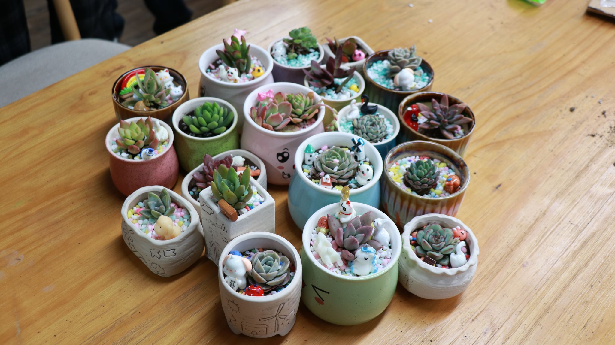 活动现场,参与者需凭废弃塑料瓶或旧书籍参与多肉盆栽DIY制作,将废旧物品循环利用的环保理念贯穿活动全程。学院精心准备了多肉植株、各式瓷质花盆、彩色铺面石及创意小摆件等丰富物料,为同学们的创作提供充足选择。创作过程中,同学们化身“园艺设计师”,细心铺石、挑选植株、搭配装饰,专注地打造专属的“掌上绿洲”。一个个普通的花盆,在大家的巧思与巧手之下,变身成各具特色、独一无二的创意盆景。