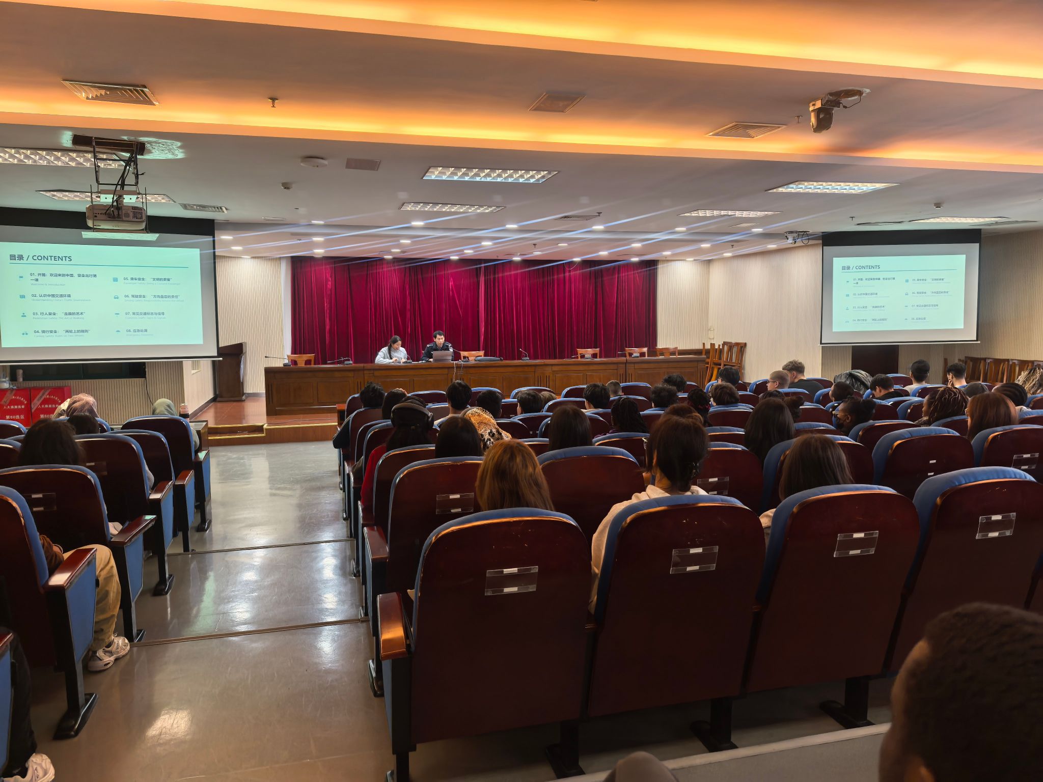 此外,南京市公安局交通管理局江宁区大队陈平警官就中国的交通环境、乘车安全、驾车安全、行人安全、骑行安全、交通标志与信号以及应急处置等内容,进行了系统讲解。陈平警官运用生动的语言、真实的视频案例和频繁的互动,引导留学生理解交通法规背后的“生命逻辑”。整场讲座气氛热烈,学生们认真聆听、积极参与。讲座结束后,留学生们纷纷表达感谢与感慨:“中国是最安全的国家,南京是最安全的城市。”大家一致认为,这里安全保障健全、犯罪率最低、法律法规完善、治安体系严密,生活在南京踏实又温暖。