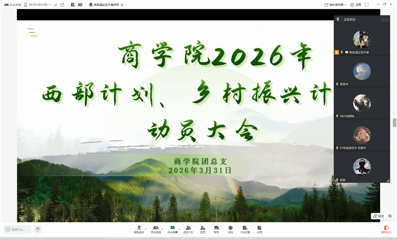 3月31日,我校商学院以线上形式召开2026年西部计划、乡村振兴计划动员大会。本次大会由商学院学工办副主任兼团总支书记徐冰洁老师主持。