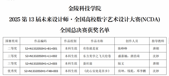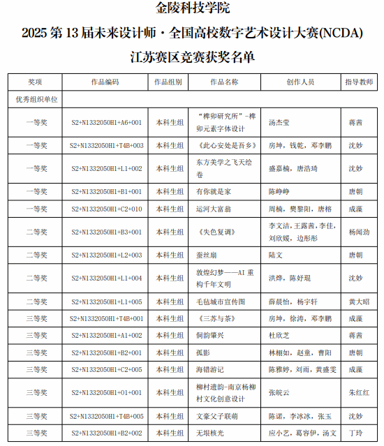 近日,第13届未来设计师·全国高校数字艺术设计大赛揭晓,金陵科技学院动漫学院获得江苏省赛区十六项奖项(其中一等奖五项),国家总决赛四项奖项。我校获得优秀组织奖,沈妙、唐朝获得优秀指导教师,成藻获评为优秀组织教师。