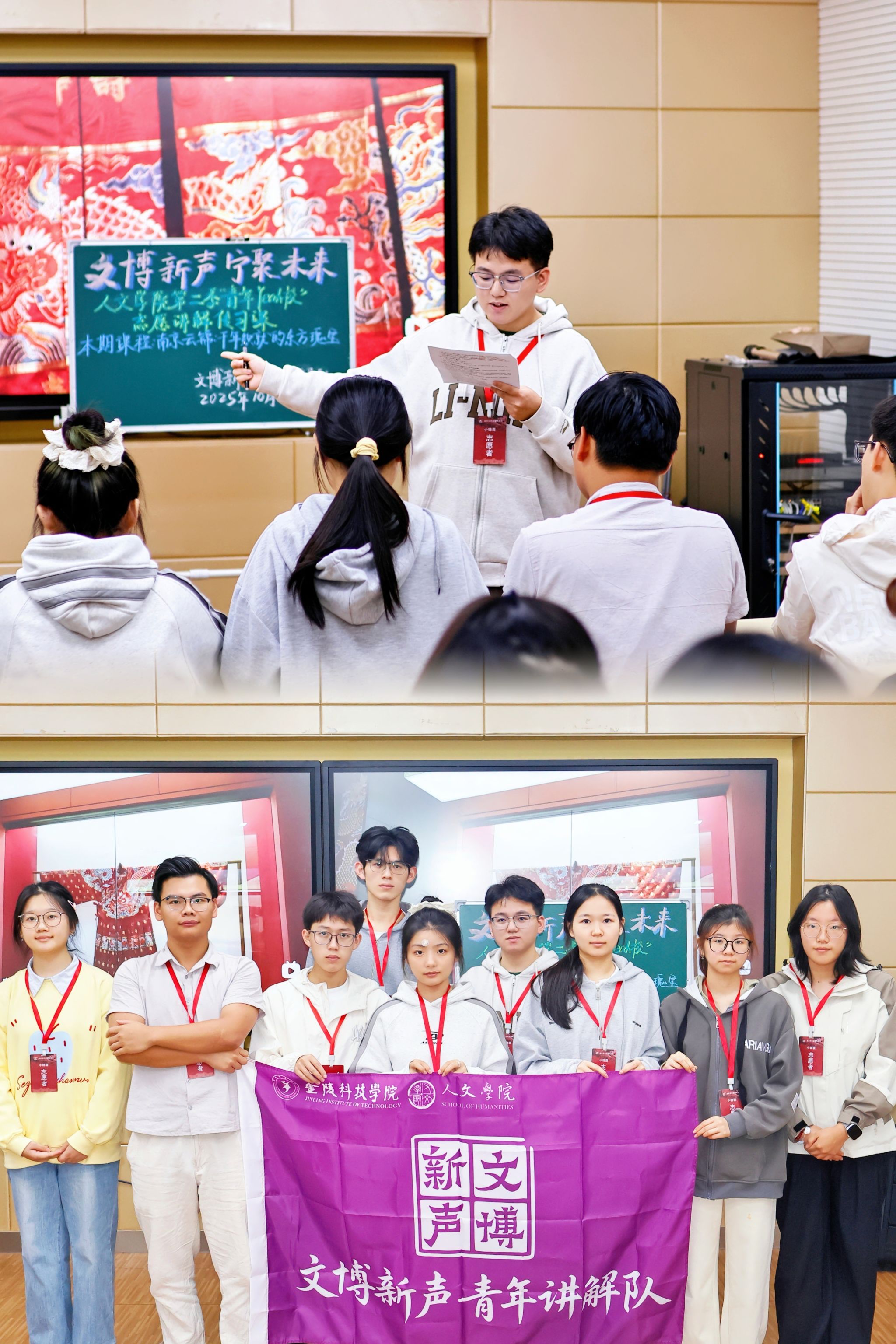 2025年,“文博新声”志愿队共组织138名志愿者上岗服务,累计服务时长达1700小时。为确保服务质量并实现团队的可持续发展,队伍坚持每学期常态化招新,系统开展多次线下培训,并重点加强了讲解员队伍的建设,创新性地开展了“薪火夜研·人文学院青年Yeah校”志愿讲解传习课程,内容涵盖《南京云锦历史与文化》《南京云锦技艺与美学》等专业知识。在讲解内容打磨上,古典文献学、汉语国际教育等专业学生充分发挥学科优势,依托《江苏手工艺史》《江苏丝绸史》等学术专著对讲解词进行梳理、考证与优化升级,让每一段讲解既保有厚重的历史质感,又具备鲜活的传播张力。