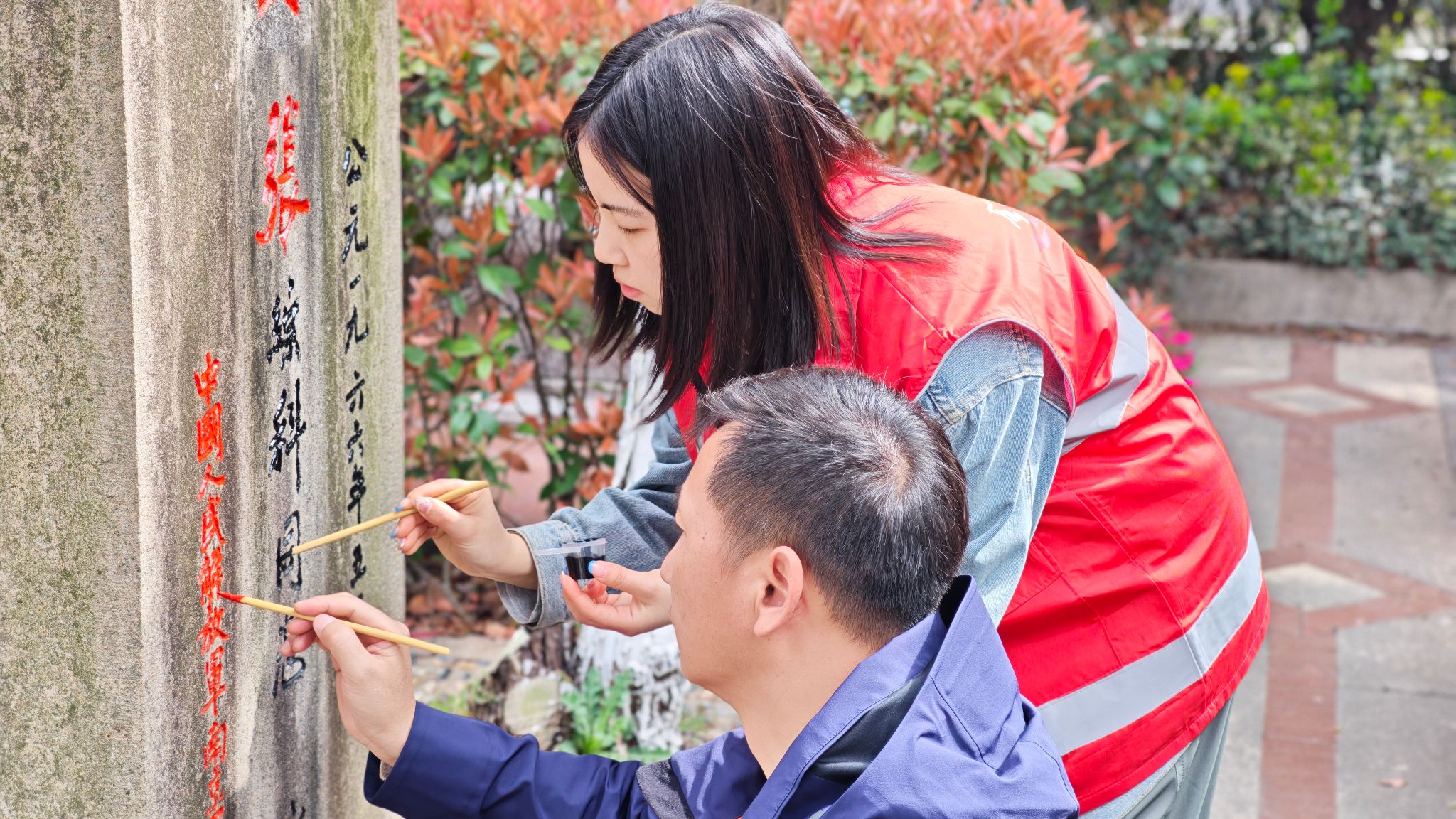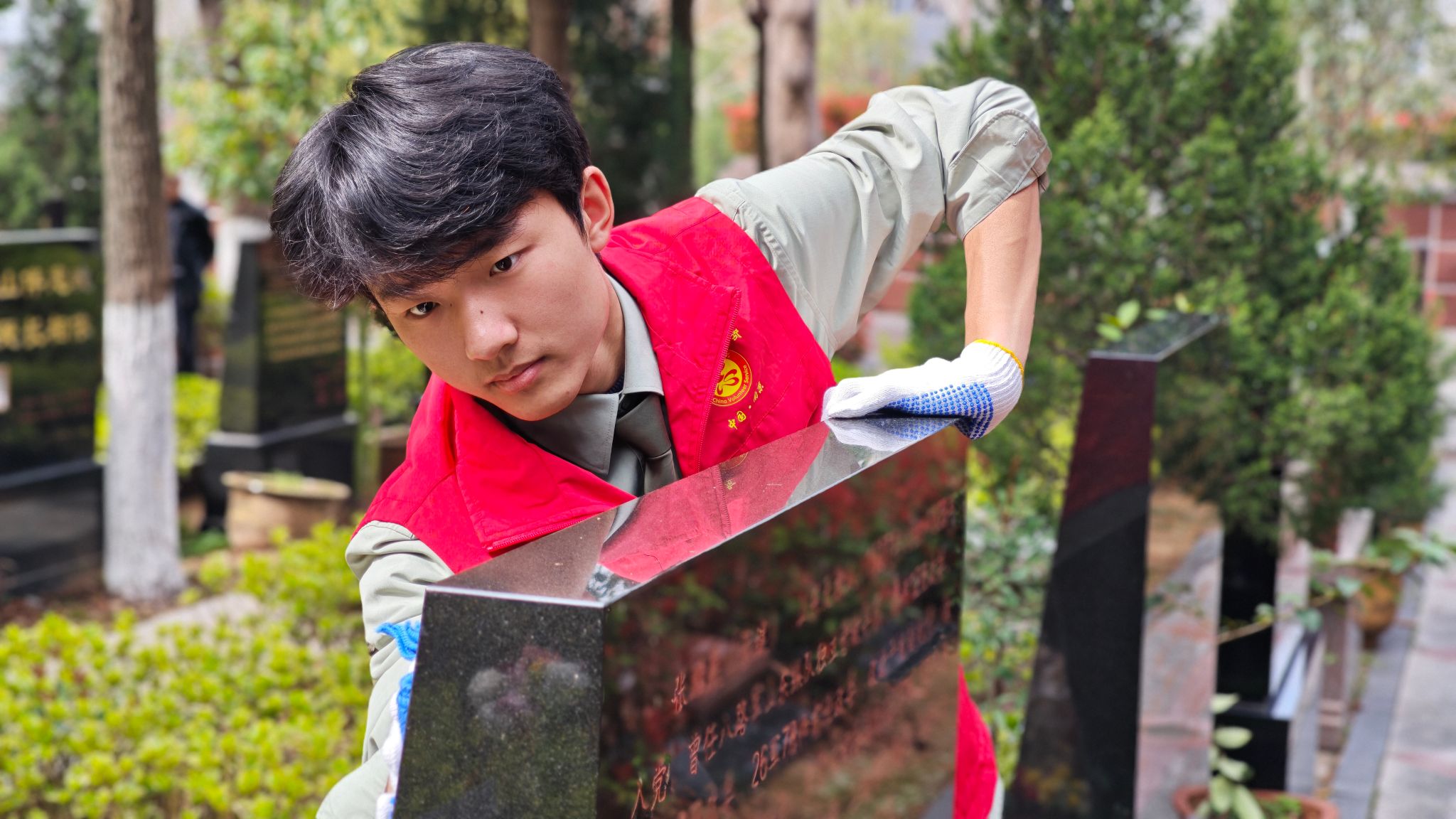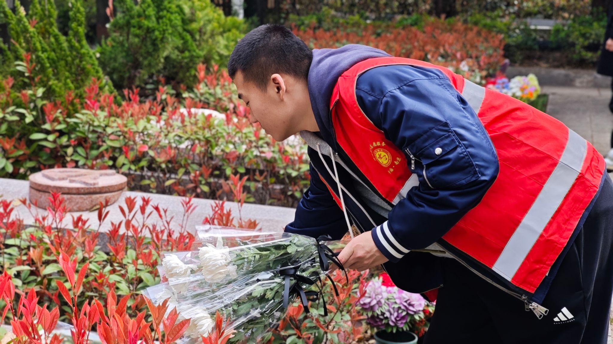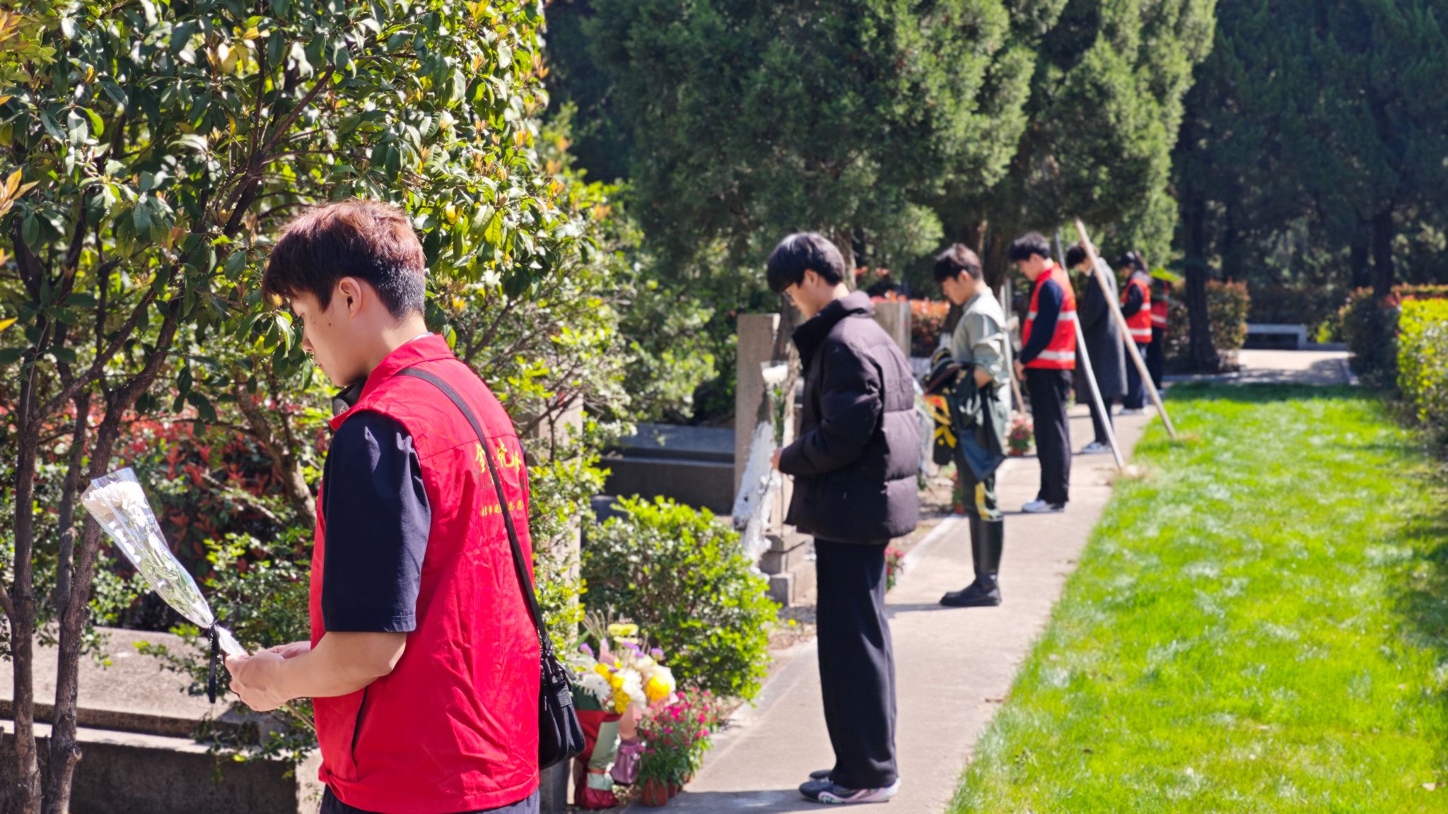 瞻仰缅怀仪式结束后,同学们前往雨花台功德园,开展祭扫与环境清扫志愿服务。大家分工协作、认真细致,精心擦拭烈士墓碑、清理墓区杂草与环境卫生,逐一敬献鲜花、鞠躬致意,以实际行动守护英烈安息之地,用躬身实践传承崇尚英雄、缅怀先烈的优良风尚,彰显了退役学子“退伍不褪色、退役不退志”的责任担当。