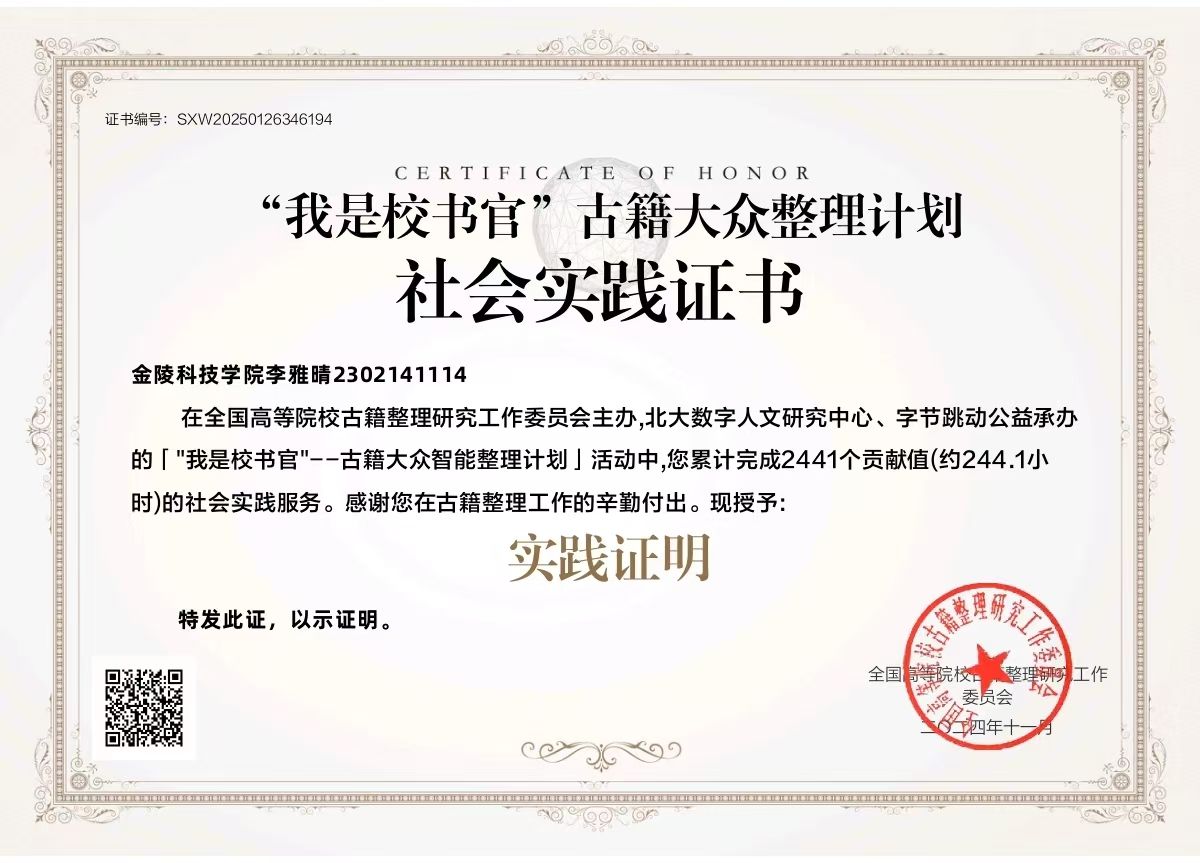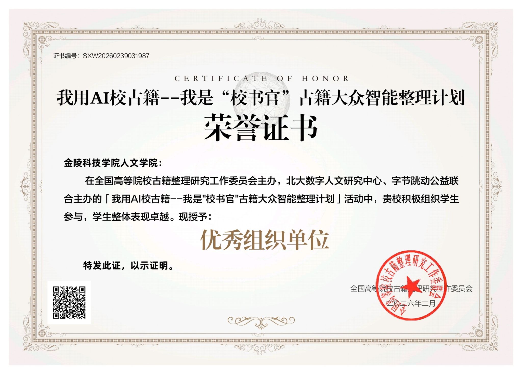 近日,由全国高等院校古籍整理研究工作委员会主办,北京大学数字人文研究中心、字节跳动公益联合主办的2025年度“我用AI校古籍——我是‘校书官’古籍大众智能整理计划”圆满收官。我校人文学院积极组织学生参与活动,凭借扎实的专业素养与突出的团队贡献,荣获“优秀组织单位”荣誉称号。