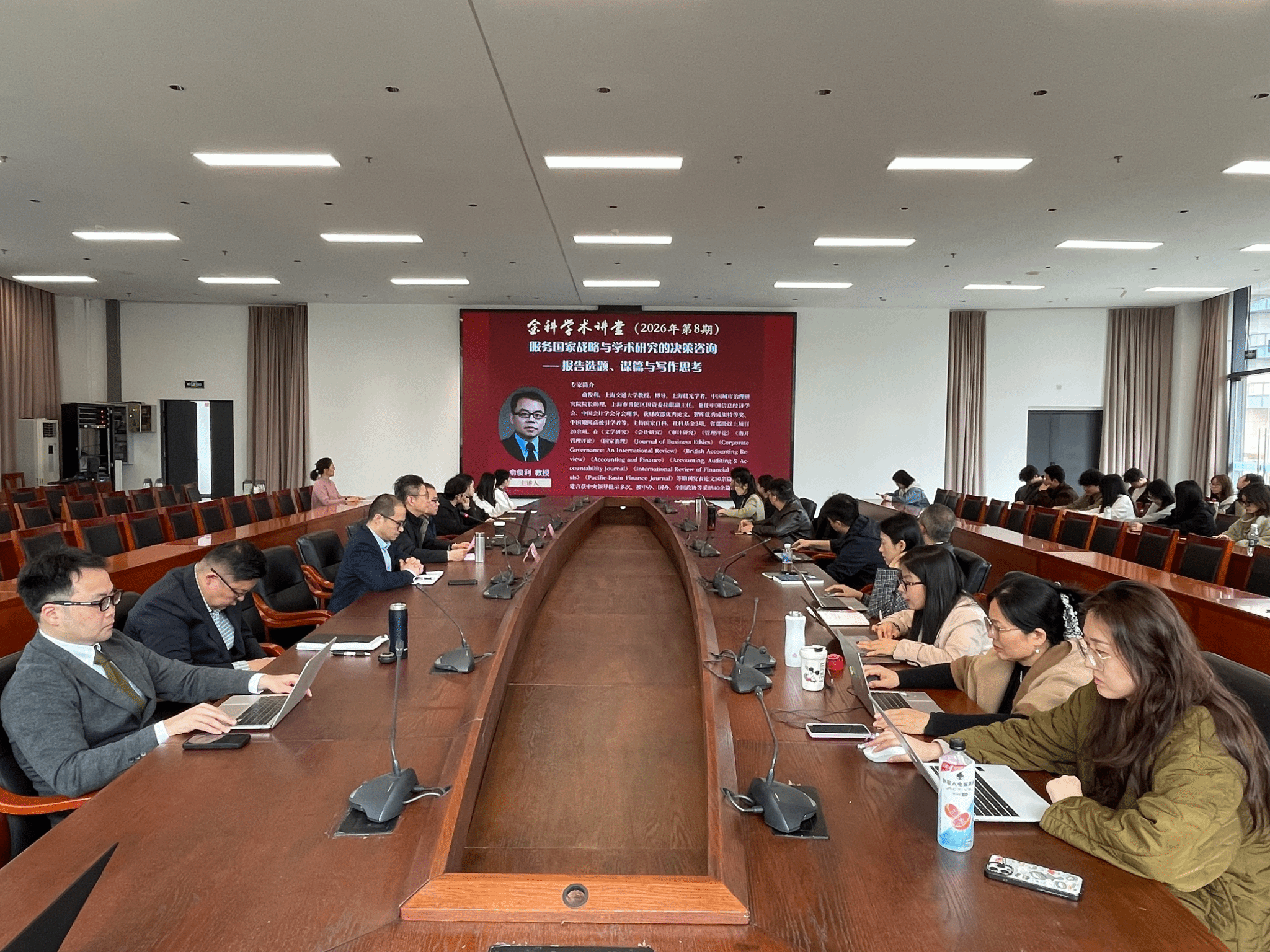 4月14日,2026年第8期“金科学术讲堂”在江宁校区科技楼3号楼110会议室圆满举办。本次讲堂特邀上海交通大学俞俊利教授为我校师生带来题为《服务国家战略与学术研究的决策咨询——报告选题、谋篇与写作思考》的专题学术讲座。讲座由商学院院长刘磊主持,商学院副院长黄阳、部分科研骨干教师,以及会计、金融专硕研究生共同参与本次学术交流活动。