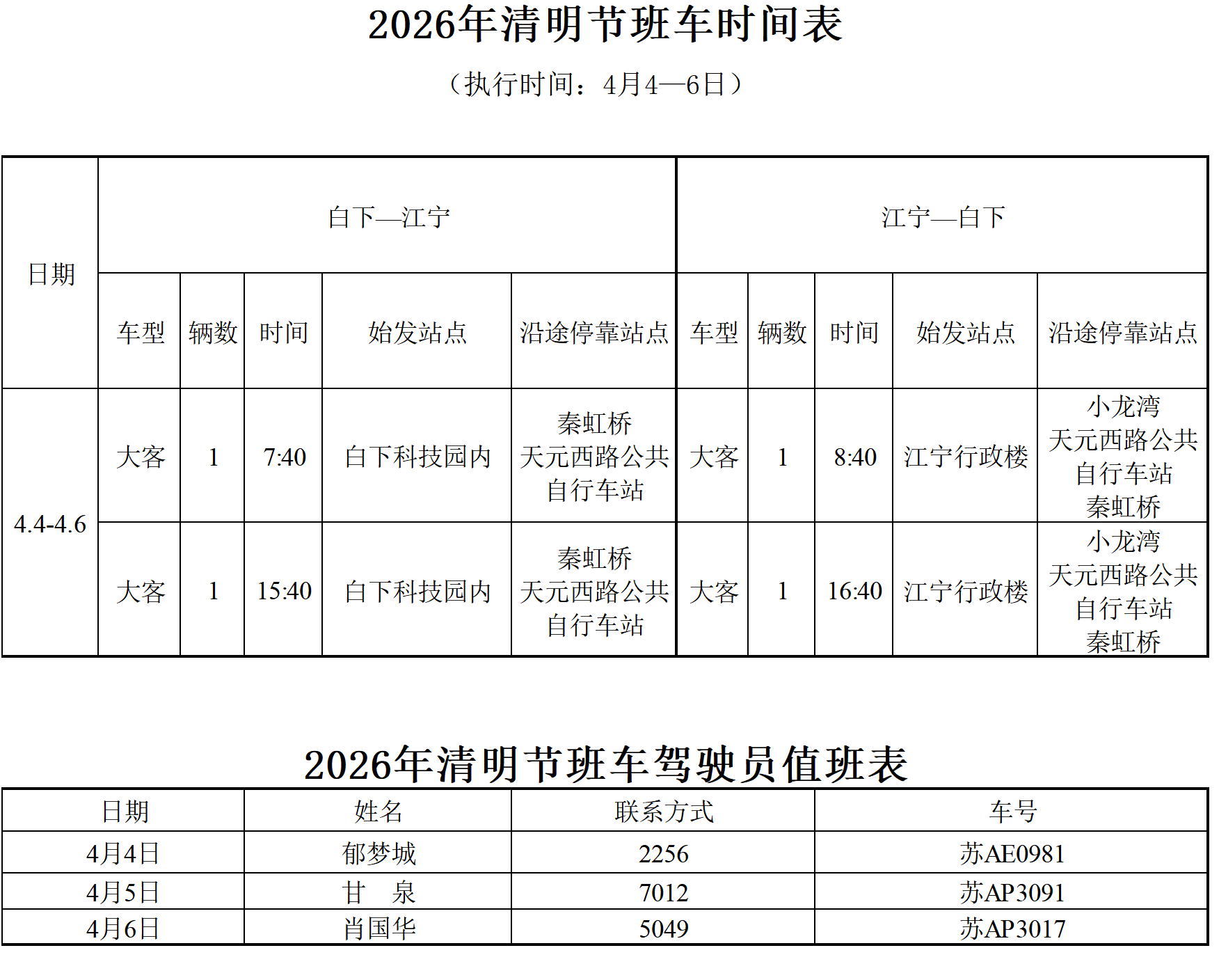 根据学校工作安排,现将2026年清明节班车时间安排公布如下: