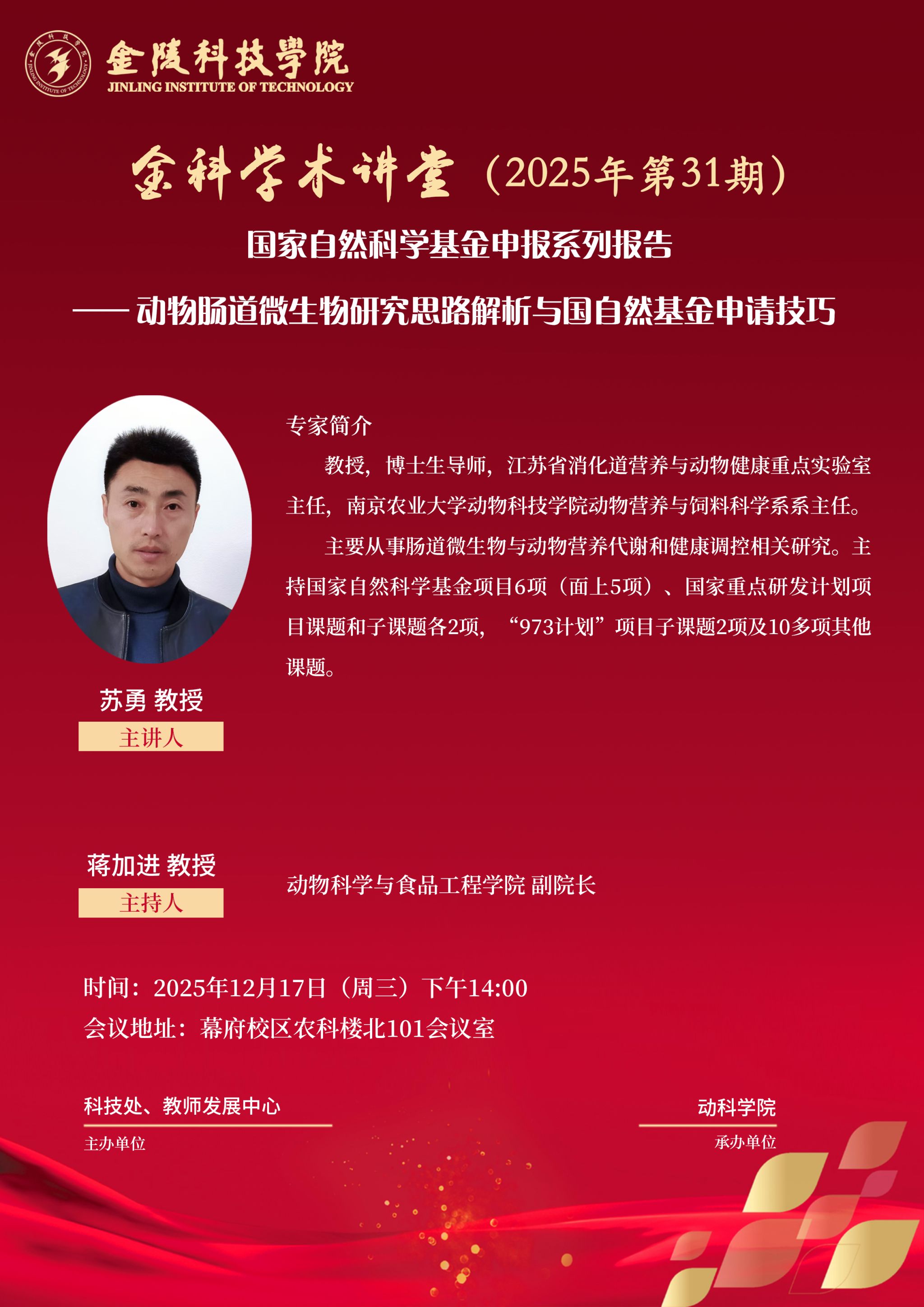 关于举办线下“金科学术讲堂:国家自然科学基金申报系列报告——动物肠道微生物研究思路解析与国自然基金申请技巧”学术报告的通知
